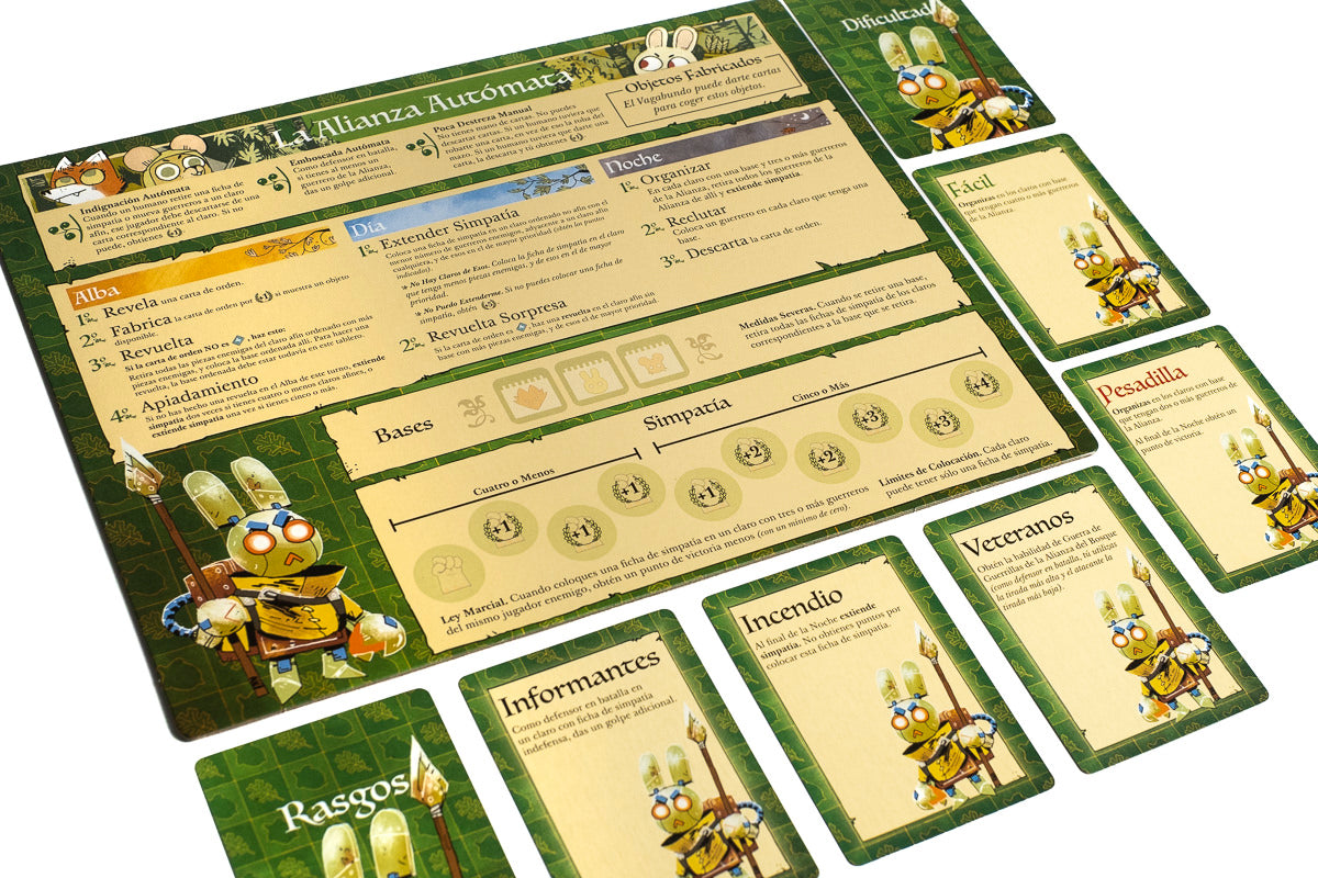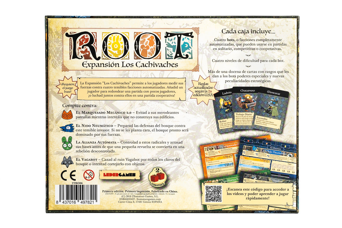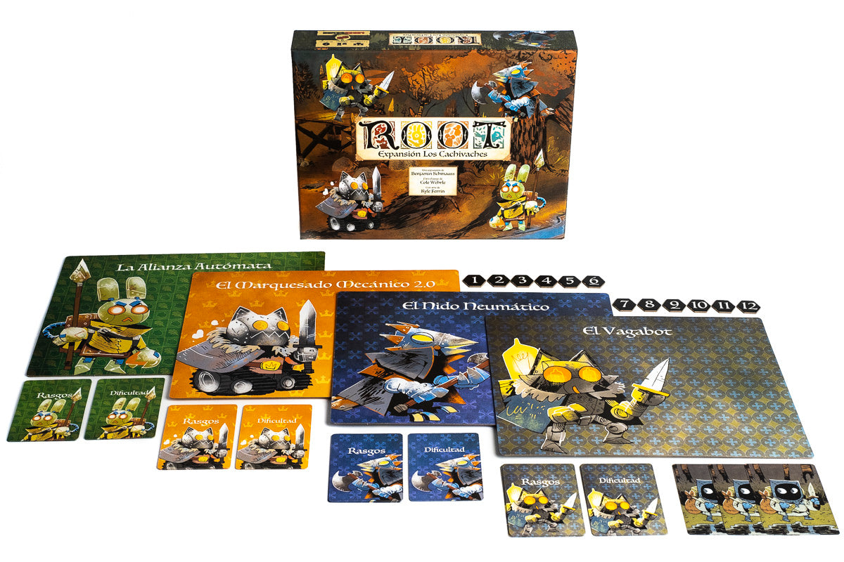 Enfréntate a las facciones automáticas más ingeniosas del Bosque. Esta expansión permite jugar Root en modo solitario o cooperativo, enfrentándote a cuatro facciones mecanizadas que imitan el comportamiento de jugadores reales. Ideal para partidas con pocos jugadores o para quienes buscan un nuevo desafío estratégico.
