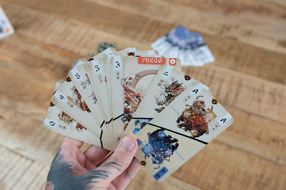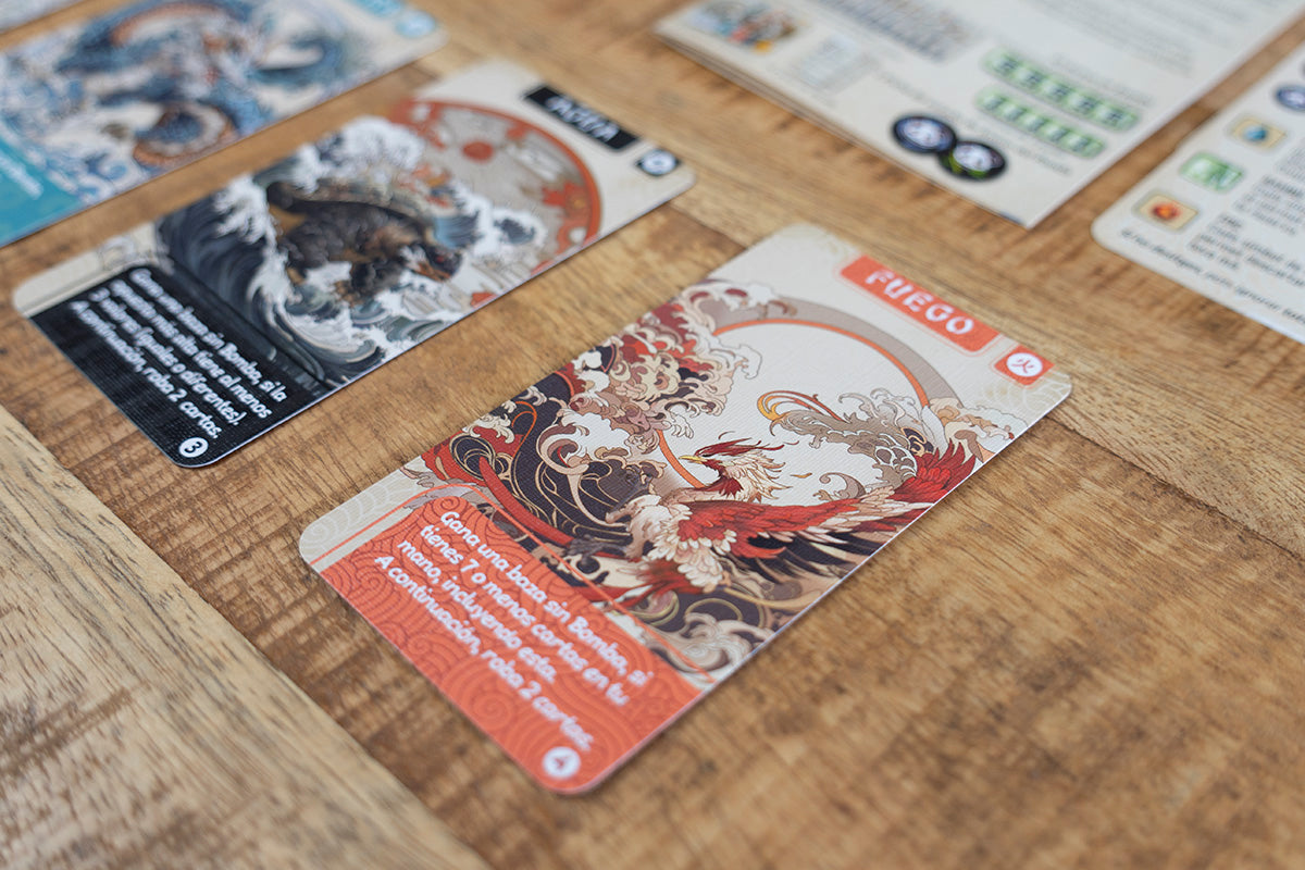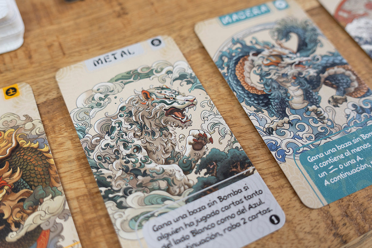 Las bazas se resuelven rápido y siempre mantienen la tensión. Hay cartas de elementos que ganan automáticamente la baza y te permiten robar más cartas, lo que añade aún más dinamismo a la partida. Cuando un jugador se queda sin cartas, anota puntos de bambú según las cartas que aún tengan sus rivales, y la ronda continúa hasta que casi todos han salido.
